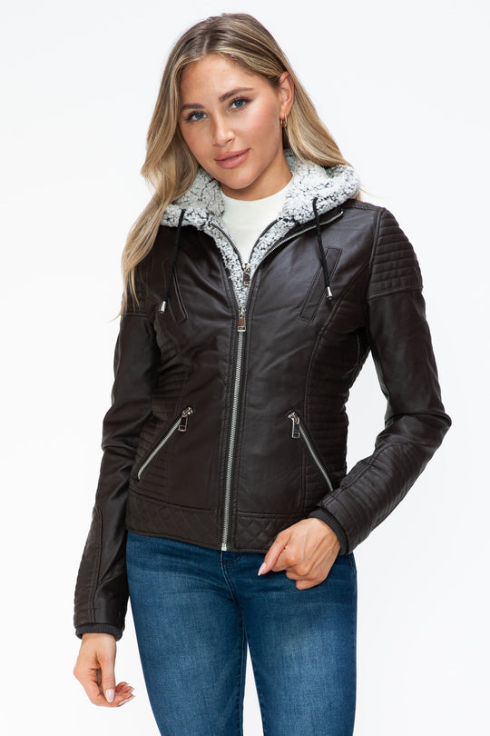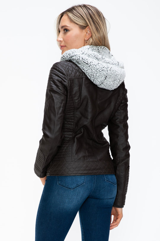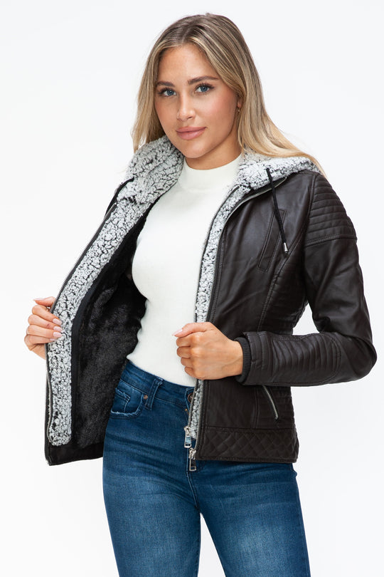 YMI Faux Layered Double-Zipper Jacket with Fuzzy Hood