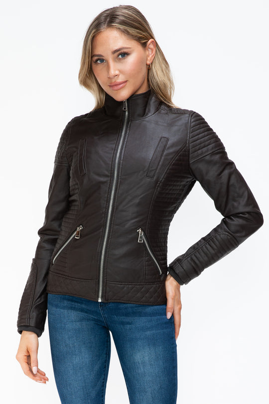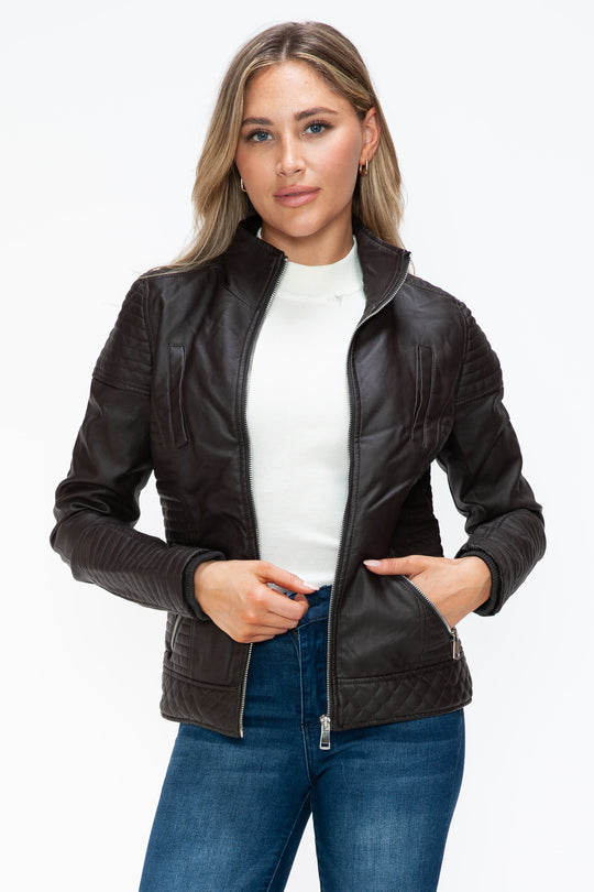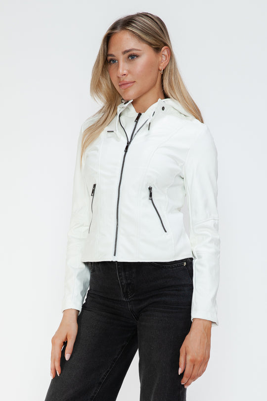 Snobbish Faux Leather Zip Up Drawstring Hooded Jacket