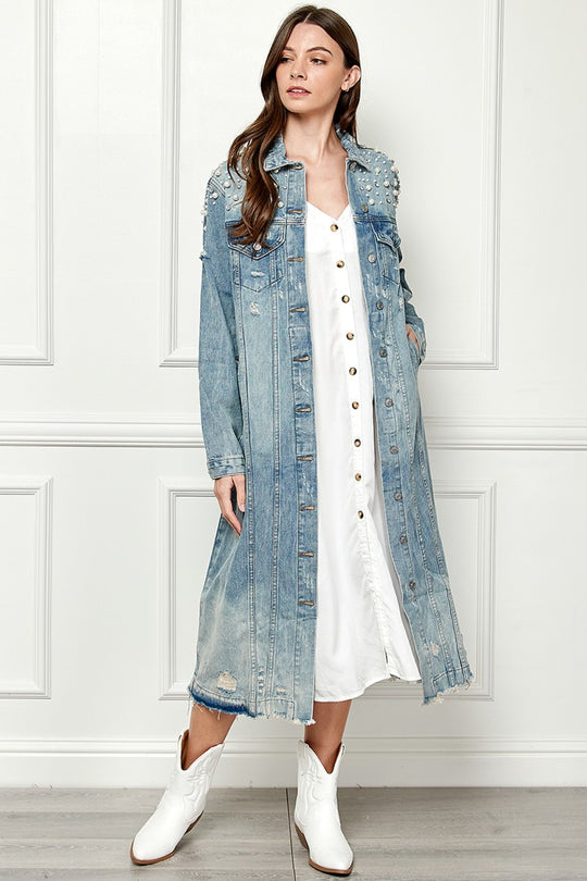 Regular price $71.99The Distressed Raw Hem Pearl Detail Button Up Jacket is a unique and fashionable addition to your wardrobe. The distressed detailing adds a trendy and edgy vibe to the jacket, while the pearl embellishments bring an... -
