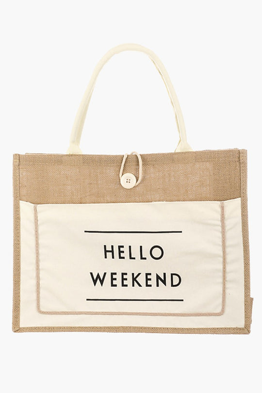 Fame Hello Weekend Burlap Tote Bag