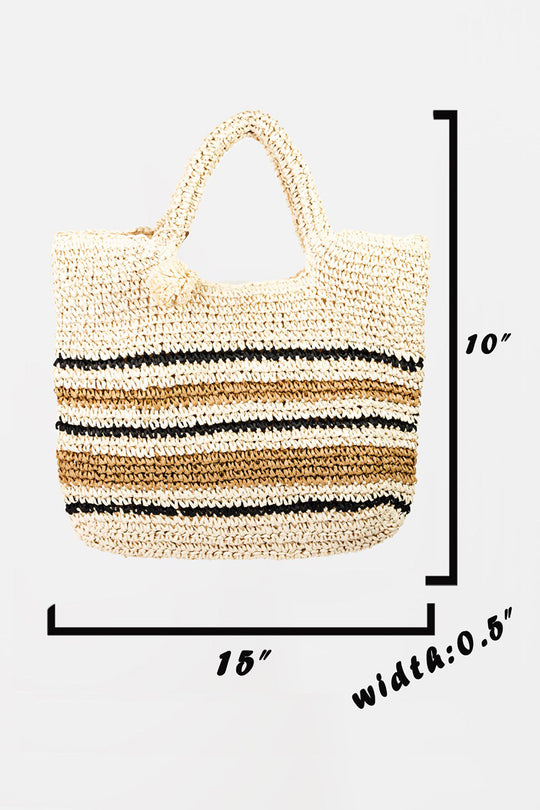 Fame Striped Straw Braided Tote Bag Regular price $51.99The Striped Straw Braided Tote Bag is a trendy and summery accessory that combines beachy vibes with a chic aesthetic. This tote bag features a unique blend of striped patterns and braided straw construction for a...