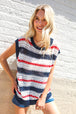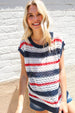 Get ready for the 4th of July festivities with this red white and blue striped sleeveless dolman crochet sweater. Loose knit and an oversized design complete this stunning top.