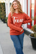 Get ready for football season with this pop up embroidered "Texas" knit sweater pullover. A round neck and an oversized fit completes this fun design.