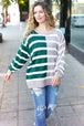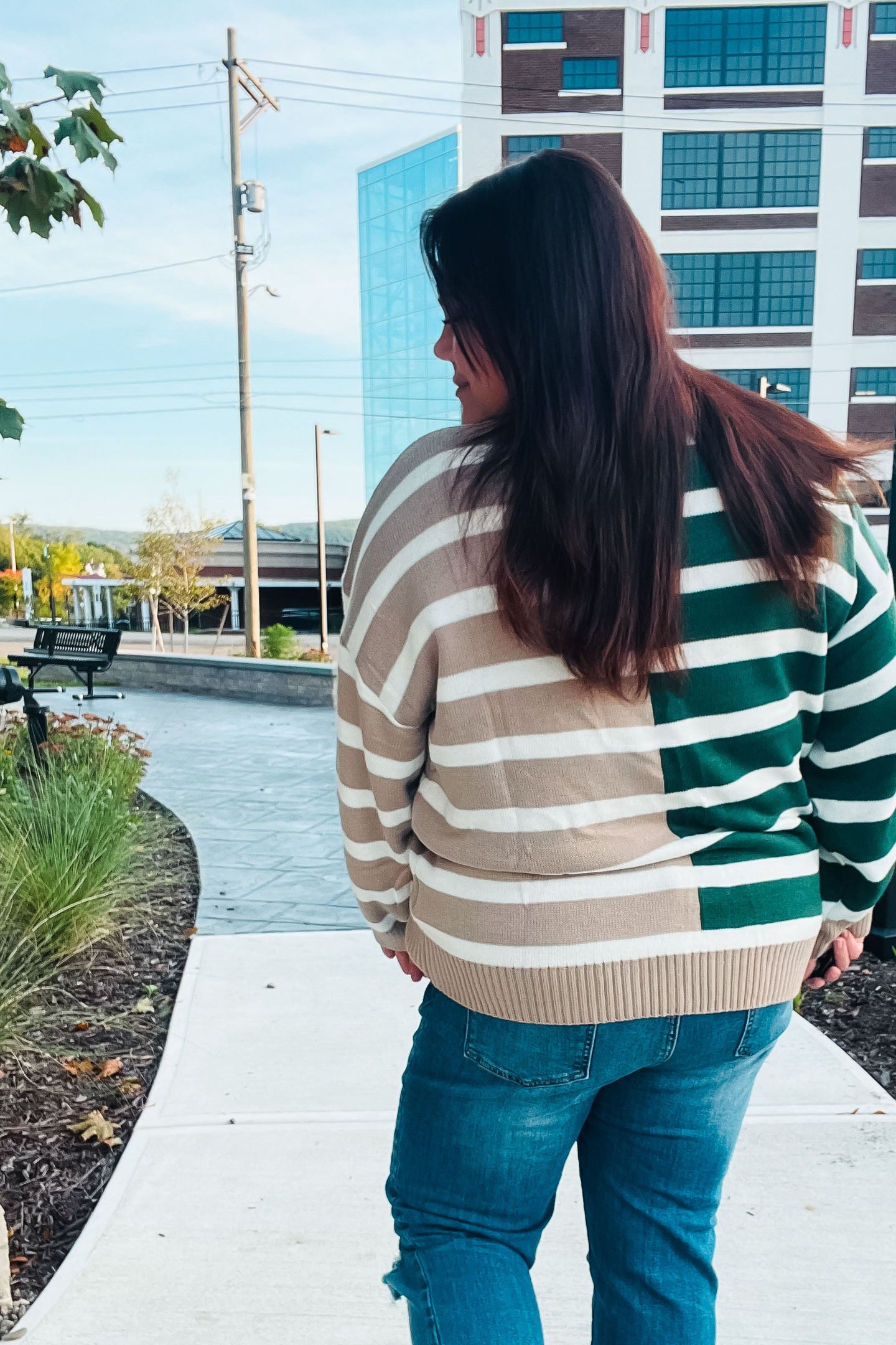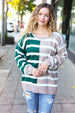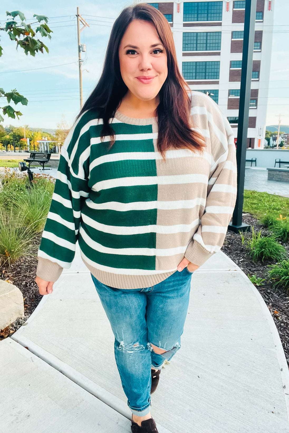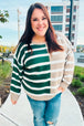 If your knit sweater game needs a refresh, reach for this round neck hunter green and taupe striped color block top. With an oversized fit and cozy knit fabric, this sweater will be your go to this fall.