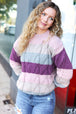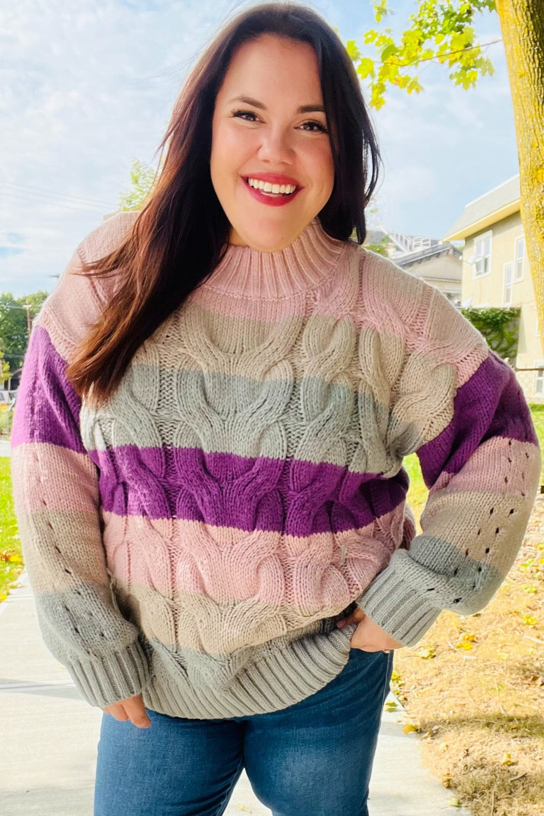 Add some fun color to your fall wardrobe with this multicolor stripe sweater with a mock neck and trendy cable knit.