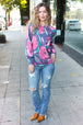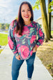 This stunning, navy floral brushed Hacci pullover with a puff long sleeve design and a banded hemline and round neck will be your go-to staple this fall. Pair with any bottoms.