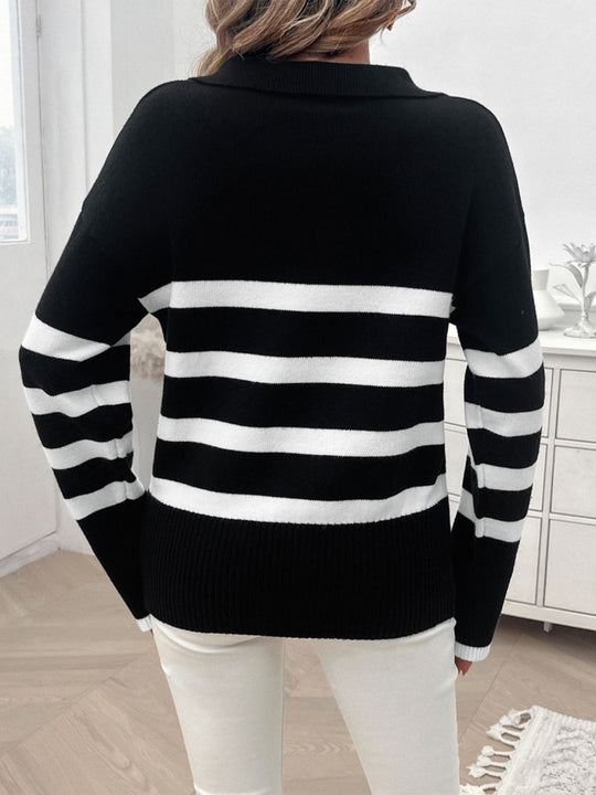 Striped Collared Neck Long Sleeve Sweater