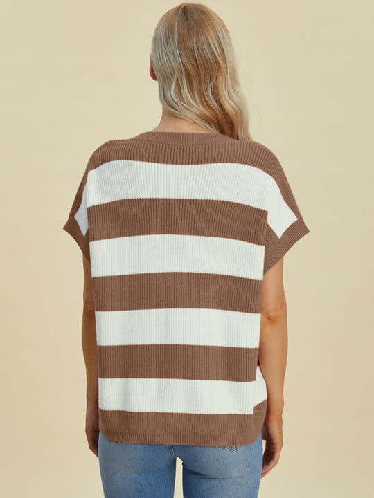 Double Take Full Size Striped V-Neck Short Sleeve Sweater
