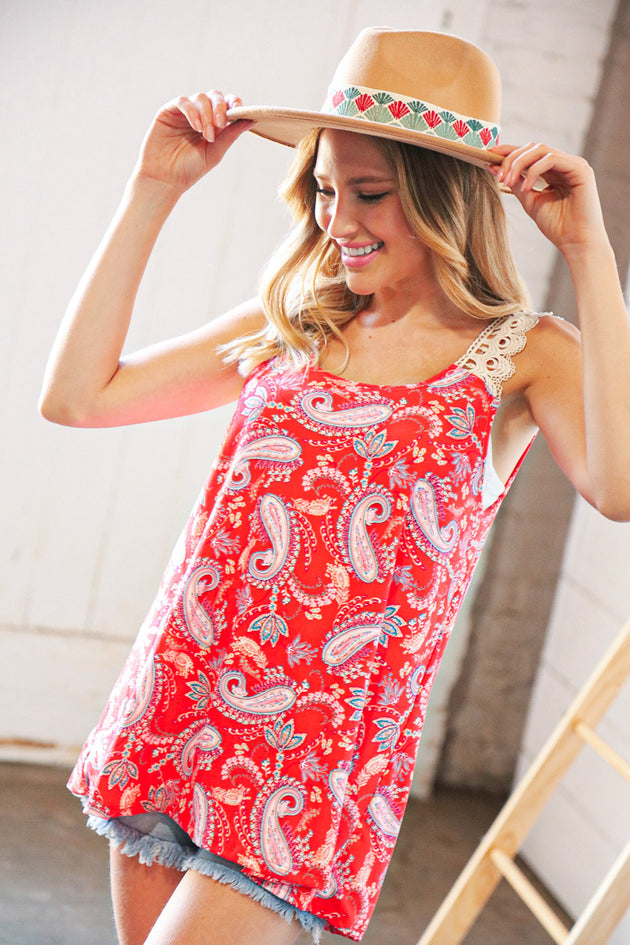Coral Paisley Scallop Crochet Strap Tank Top
