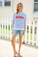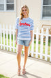 Slip on this pop up embroidered "America" sweater top featuring a round neck, short puff sleeves and soft knit. Get your adorable on with this fun patriotic sweater top!