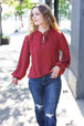 Add feminine flare to your fall closet with this gorgeous crinkle woven blouse with long bubble sleeves. A frill edge V neck and a tie neck complete a sublime look!