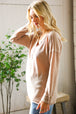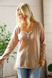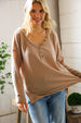 This cuffed long sleeve Henley pullover features textured knit, side slits and outseam reverse stitching. Super soft with stunning cut edge details and drop shoulders, this will soon be your fall go-to staple!