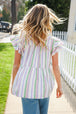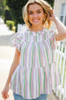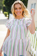 Get ready for date night in this lavender and sage romantic double ruffle short sleeve top with a tiered design and round neck. A back clasp keyhole completes this charming style.
