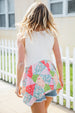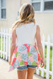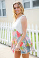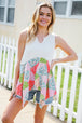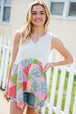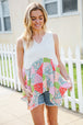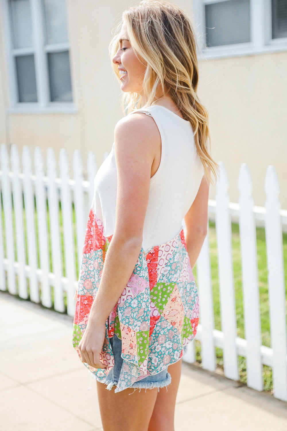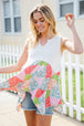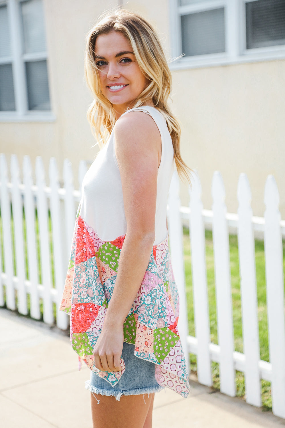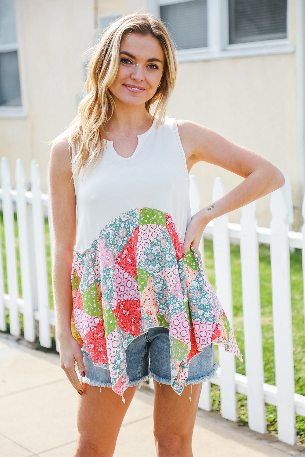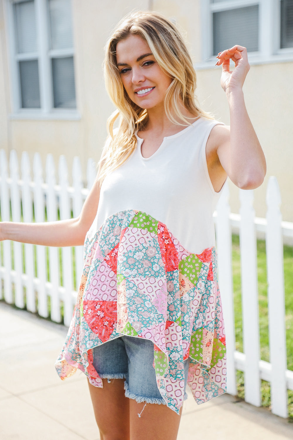 Bring on sun, sandals and all-things-feminine with this terry notched neck sleeveless top featuring a patchwork print and shark bite hemline. Step into summer with confidence in this color block, flattering style!