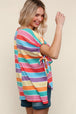 This thermal knit Hi-Lo stripe top features a stunning pallet of colors and ribbon bow tie short Dolman sleeves. With a classic round neck, tuck in or tuck out for a trendy styling.