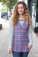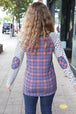 Light weight and perfect for layering, this color block pullover made with French terry is designed with plaid, stripes, outseam stitching and elbow patches on long fitted sleeves. Glam up all your denim with this trendy top!