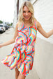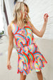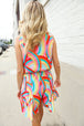 This charming and playful floral print romper is packed with summer styling trends, from neck ribbon tie bows, a godet flare hem design to a back neck button closure. Add some adorable to your summer closet with this cute romper!