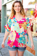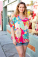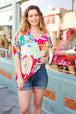 This multicolor big floral print woven dolman top with banded short sleeves, a wide V neck and a drop shoulder design has a flattering drape and adds casual charm to any outfit.