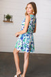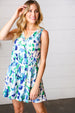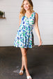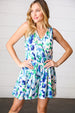 Highlight your fun side with this green and blue floral print surplice flared shorts romper with an elastic waist. A beautiful drape and side pockets complete this stunning style.