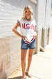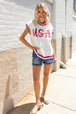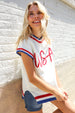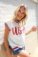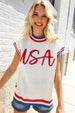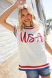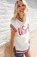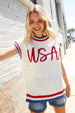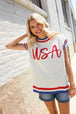 Slip on this pop-up embroidered "USA" sweater top featuring a round neck, dolman short sleeves, side slits and a ribbed hem. Get your adorable on with this fun, 4th of July ready sweater knit top!
