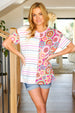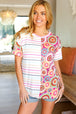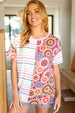 Look more than lovely in this stunning, buttery smooth top with contrasting stripes and crochet print. Get your spring on with this round neck short sleeve top!