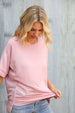 This short sleeve loose fit knit pullover features cap short sleeves and a hi-lo hem design. Super soft with stunning outseam reverse stitching, this will soon be your fall go-to staple! Wear with all your denim.