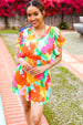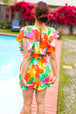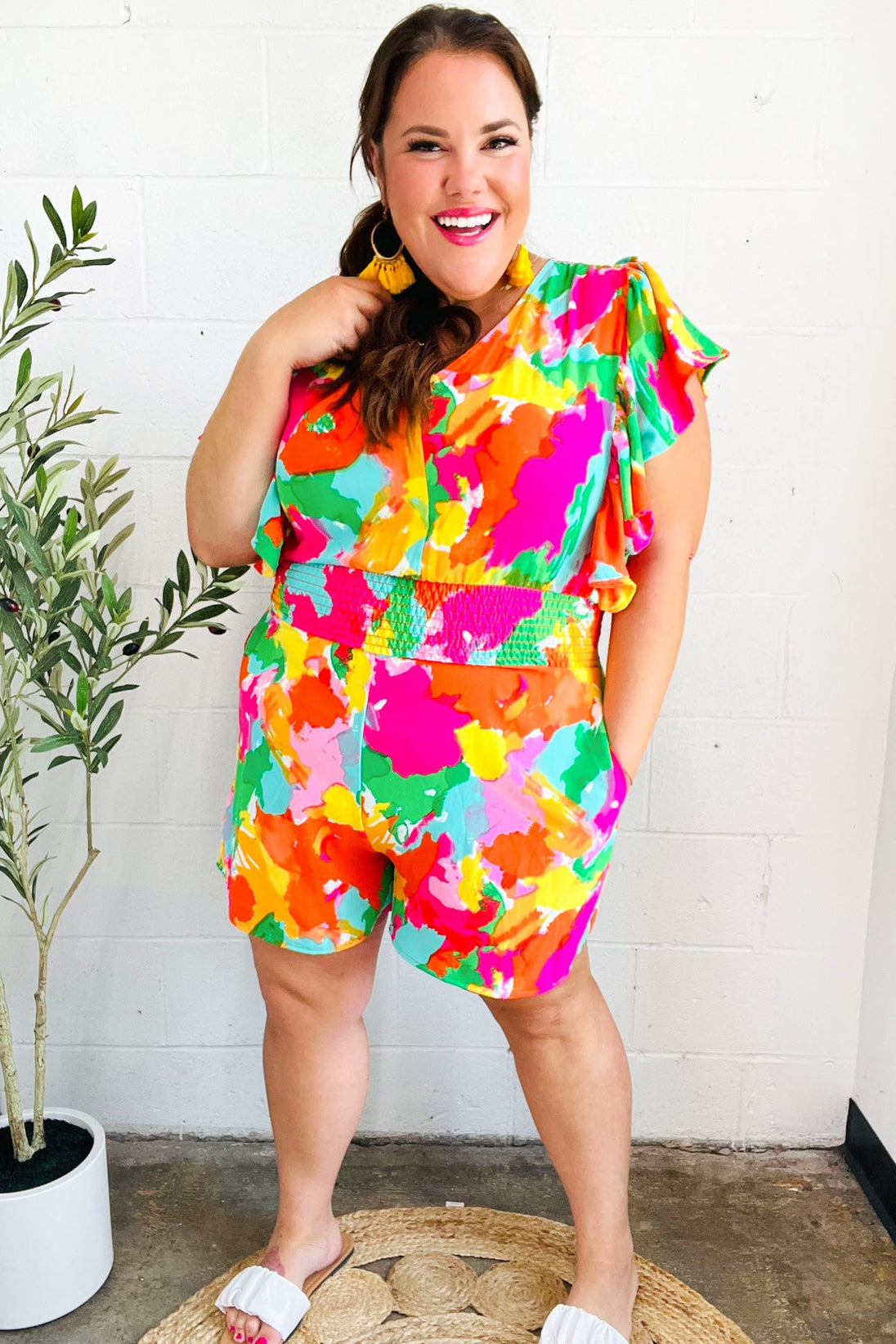 Showcase your fun side with this multicolor abstract floral print woven V neck romper. Designed with side pockets, a smocked waist, flutter ruffle sleeves and a fit & flare style, look stunning in this flattering romper!