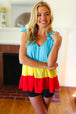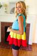 Add a flirty twist to your summer outings with this woven bubble crepe tiered sleeveless top featuring charming shoulder tie bow straps and a ruffle hemline.