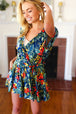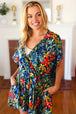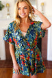 ighlight your fun side with this navy tropical floral print surplice flared shorts romper with an elastic waist and tie belt. A beautiful drape and side pockets complete this stunning style.