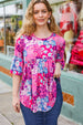 Add a pop of color to your spring wardrobe with this eye catching floral print babydoll top featuring 3 quarter bell sleeves.
