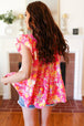 Make a statement with this pink floral print crinkle woven tiered ruffle top with a back clasp keyhole. Designed with flutter sleeves and merrow stitching, this charming top with a linen feel is simply divine.