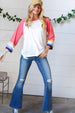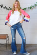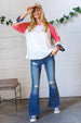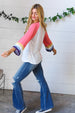 Take your love of cute, cozy knitwear into the warmer months with this stunning pointelle knit color block pullover top made with three-quarter wide sleeves.