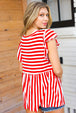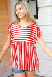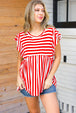 Brighten your closet with this eye catching red striped top sporting a round neck and ruffle short sleeves. Perfect for your 4th of July festivities, comfy & casual.
