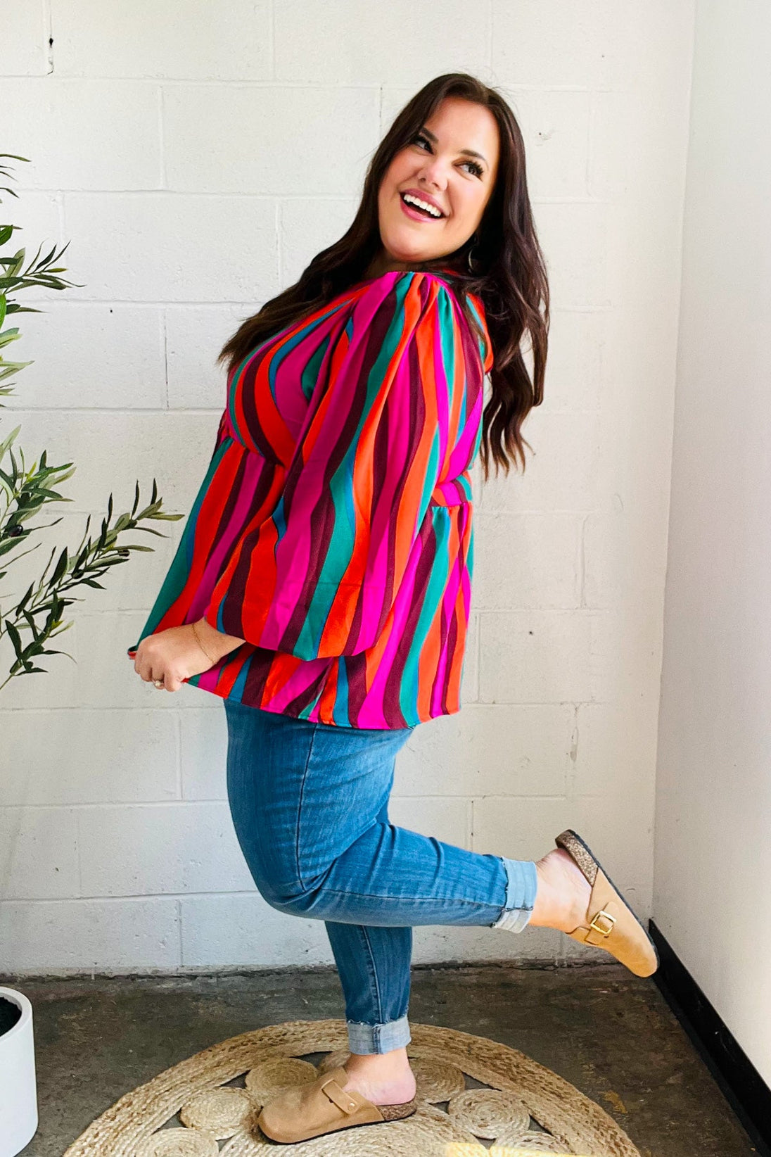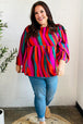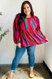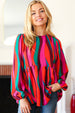 Lightweight and perfect for layering under cardigans or jackets, this rust and berry babydoll peplum top with abstract print has a round neck to showcase your fav accessories. Featuring long, elegant bubble sleeves, slip this top on for the office or date night!