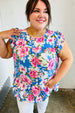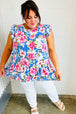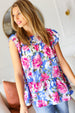 Make a statement with this sky blue floral print tiered ruffle top with a back clasp keyhole. Designed with flutter sleeves and Merrow stitching, this charming top with a linen feel is simply divine.
