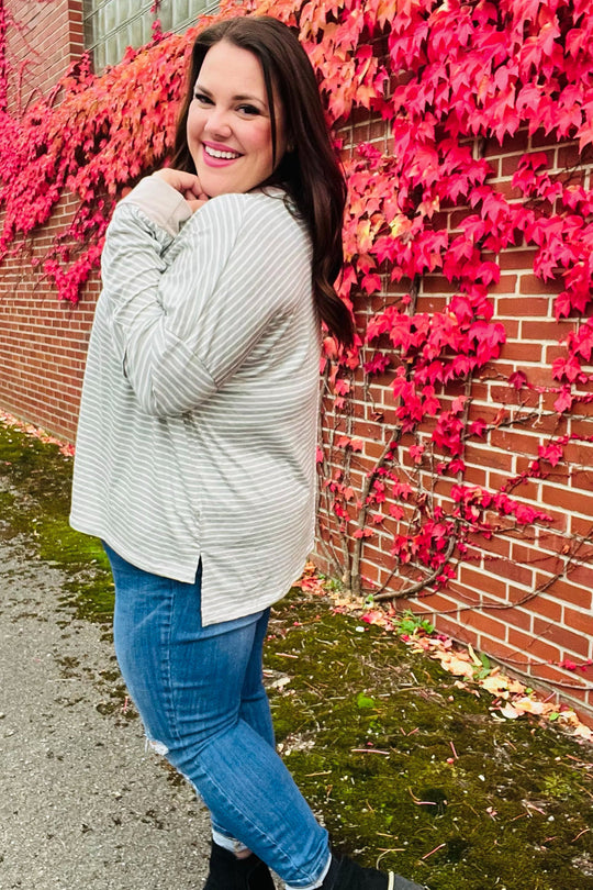 Regular price $22.99If your knit sweater game needs a refresh, reach for this round neck hunter green and taupe striped color block top. With an oversized fit and cozy knit fabric, this sweater will be your go to... -