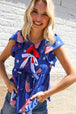 Get ready for 4th of July festivities with this blue woven babydoll top adorned with patriotic prints: American flag, ribbons and stars! Folded flutter sleeves complete this adorable top.