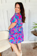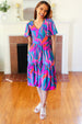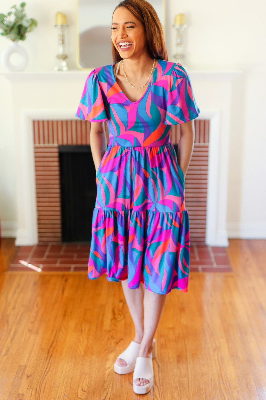 Keep your look breezy and feminine with this geometric print ruffle sleeve dress featuring side pockets, and a V neck. A fit and flare design completes this dress.