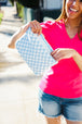 Add a bit of adorable to your travel ensembles with this knit blue & white checkered cosmetic travel bag designed to carry cosmetics, accessories, or other necessities in style. It features a zippered closure, lining and is expandable!