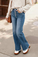 Channel vintage vibes with the Buttoned Up & Flared Jeans! These high-rise denim beauties feature a statement button fly, flattering fit, and a subtle flare with playful frayed hems. Designed to elongate your legs and accentuate your shape, they’re the perfect mix of classic and cool. Pair them with a cozy sweater or a tucked-in blouse. These jeans bring effortless style to every season.