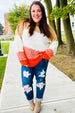 Cozy up this season with this color block knit sweater. Drop shoulders and a ribbed round neck and hemline complete this oversized fit sweater.