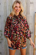 This top has such a fun, artsy vibe to it. The print is bold with a mix of reds, olives, black, and a little orange. It reminds us of brush strokes or like abstract florals. The fabric is lightweight and airy, but not sheer, which is always a win.