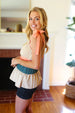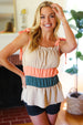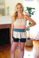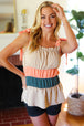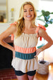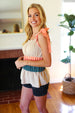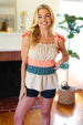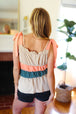 This delicate woven sleeveless top has a romantic vibe with its tie knot shoulder details and a color block of tan, peach and azure blue. An elastic ruffle square neck and a pulled Merrow hem complete this adorable top.