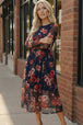 Romantic, flowy, and beautifully feminine. This floral midi dress is made to turn heads. Featuring a navy mesh overlay adorned with rich red and blush blooms, it has a dreamy, airy movement with every step. The sheer long sleeves add a soft, elegant touch, while the fitted waist and mid length skirt create a flattering, timeless silhouette. Perfect for events, date nights, family photos, or any moment you want to feel gorgeous.