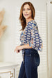 This printed blouse features a flattering V-neckline and three-quarter sleeves, creating a chic and sophisticated look. The tie hem detail adds a playful and feminine touch, making it a versatile piece that can be dressed up or down for any occasion.